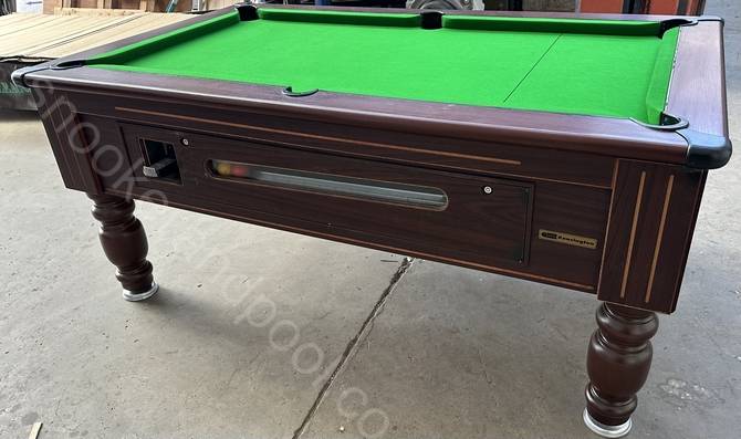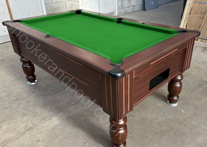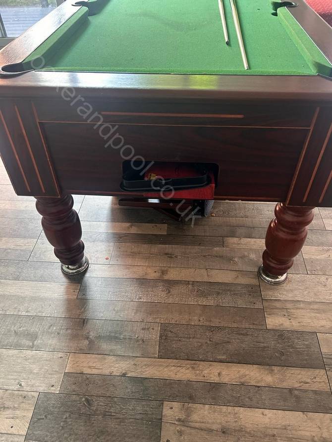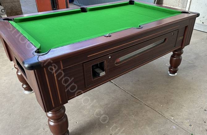 Coin operated slate bed pool table, recently refurbished and fitted with a top quality Strachan pool cloth, traditional styling, mahogany finish, solid hardwood legs, ideal for many occasions - pub, works canteen, school, pub, club or domestic